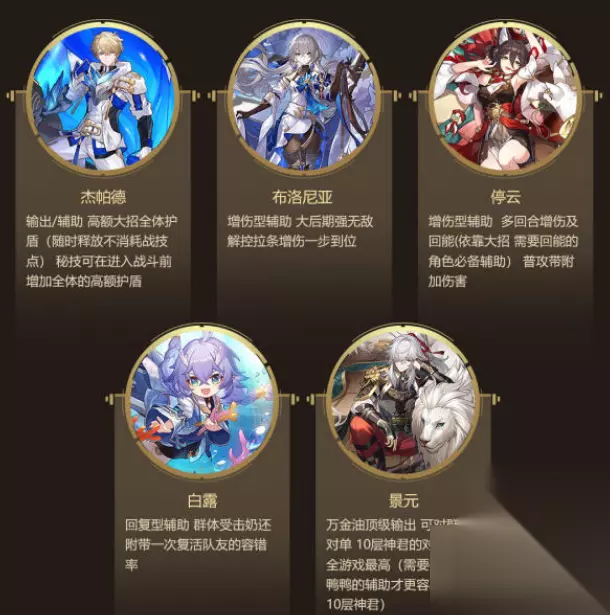 最新全角色强度排行梯级一览" style="text-align: center; text-indent: 0px;"> 崩坏星穹铁道角色强度排行榜2023最新 T0 榜: 1、杰帕德:输出/辅助高额大招全体护盾随时释放不消耗战技点,秘技可在进入战斗前增加全体的高额护盾 2、布洛尼亚:增伤型辅助,大后期强无敌,解控拉条增伤一步到位。 3、停云:增伤型辅助,多回合增伤及回能依靠大招需要回能的角色必备辅助普攻带附加伤害。 4、白露:回复型辅助,群休受击奶还附带一次复活队友的容错率。 5、景元:万金油顶级输出,可对群可对单10层神看的对单倍率,全游戏最高需要停云和鸭鸭的辅助才更容易叠满10层神君。