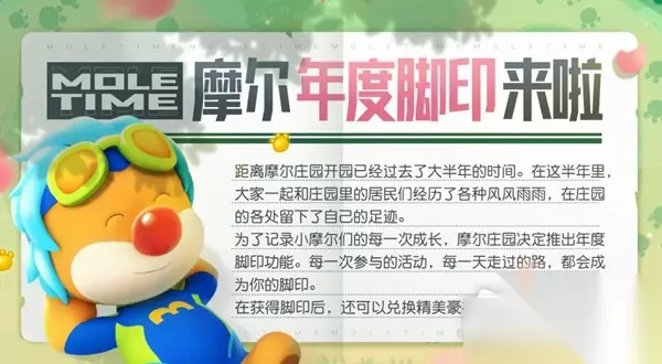 《摩尔庄园》推出摩尔年度脚印功能,它在原有摩尔脚印(图鉴)基础上升级,可记录小摩尔在庄园的活动与成长,收集点亮的脚印还能兑换礼品奖励。