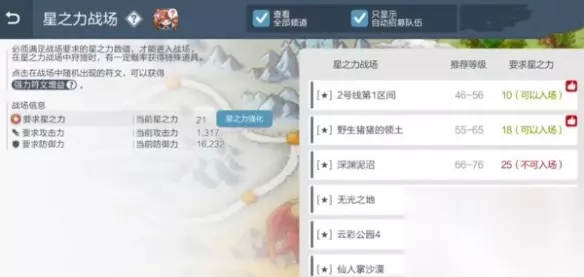 4、对于挂机地点,比较推荐玩家选择星之力战场,挂进战斗后等级升得比较快。5、进入星之力战场需要根据自身等级以及星之力等级选择最高等级战场战斗。