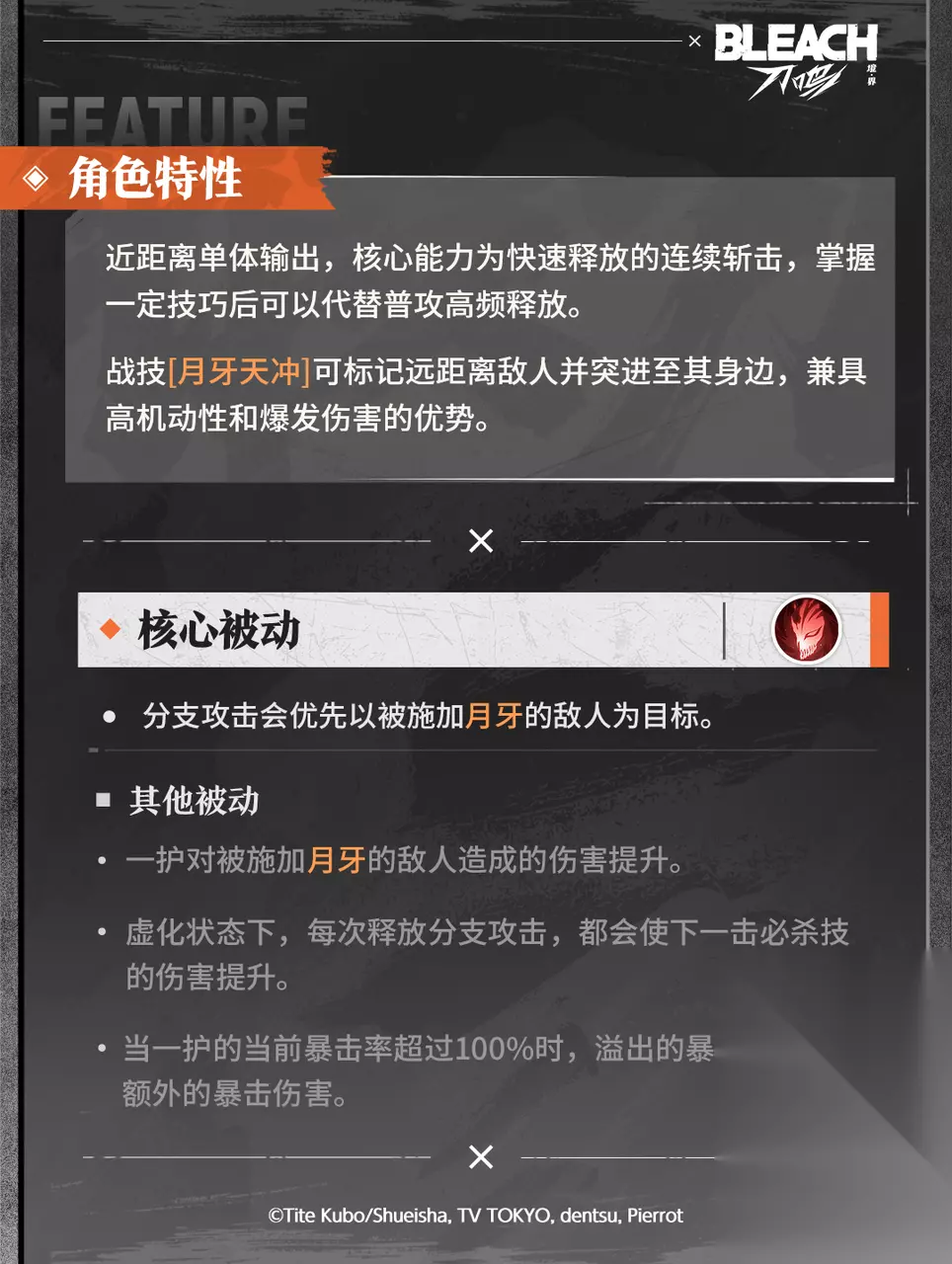 就读于空座第一高中的高三学生。橙色的头发和经常皱起眉头的表情经常被认为是不良,但实际上是义理坚强温柔的性格。除了灵感很强以外,他只是普通的高中生。但与朽木露琪亚相遇后,作为死神代理与虚战斗。 游戏中的卍解一护是近距离单体输出角色,战技「月牙天冲」可远距离标记敌人并突进至敌人身边。必杀技还可让一护进入虚化状态,使其技能威力和生存能力都将得到进一步提升。卍解一护兼具高爆发能力和机动性,能适应多种战场,是斩系队输出核心选手。 点击下方图片,一起查看卍解一护的技能详情吧!*研发中版本,不代表游戏最终品质