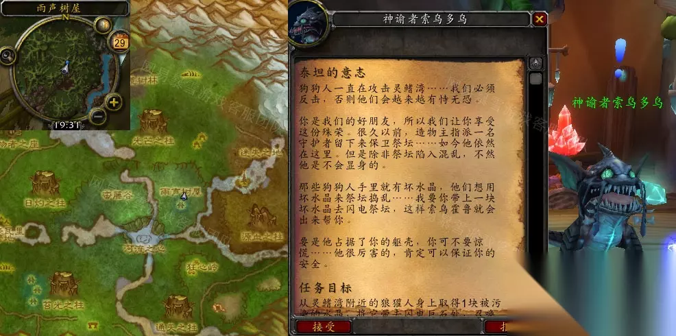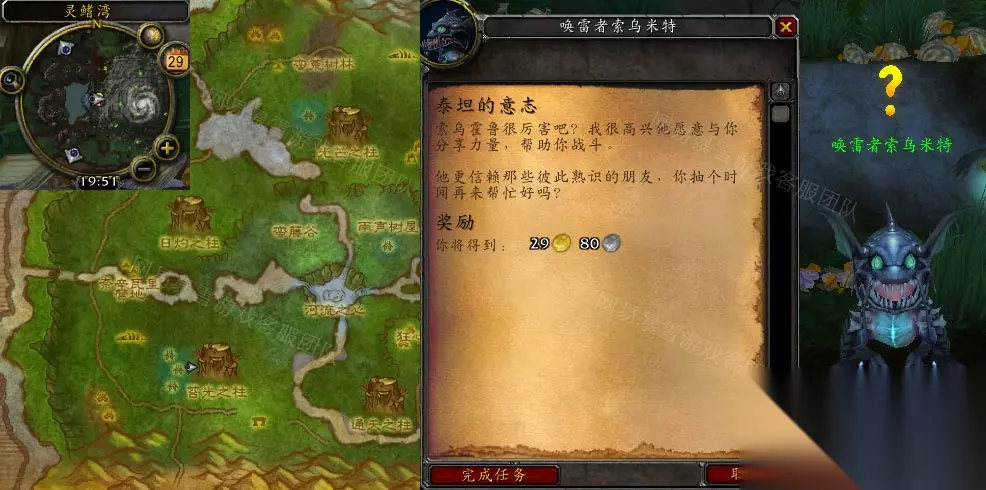在《魔兽世界》怀旧服WLK版本中,有不少小伙伴还不清楚泰坦的意志任务怎么完成,所以小编给大家带来了《魔兽世界》怀旧服wlk泰坦的意志任务的攻略介绍,感兴趣的小伙伴快进来看看吧! 《魔兽世界》怀旧服wlk泰坦的意志任务攻略 接取等级:76 接取NPC:神谕者索乌多乌(索拉查盆地,雨声树屋) 完成NPC:唤雷者索乌米特(索拉查盆地,灵鳍湾) 奖励声望:700神谕者 任务开始: