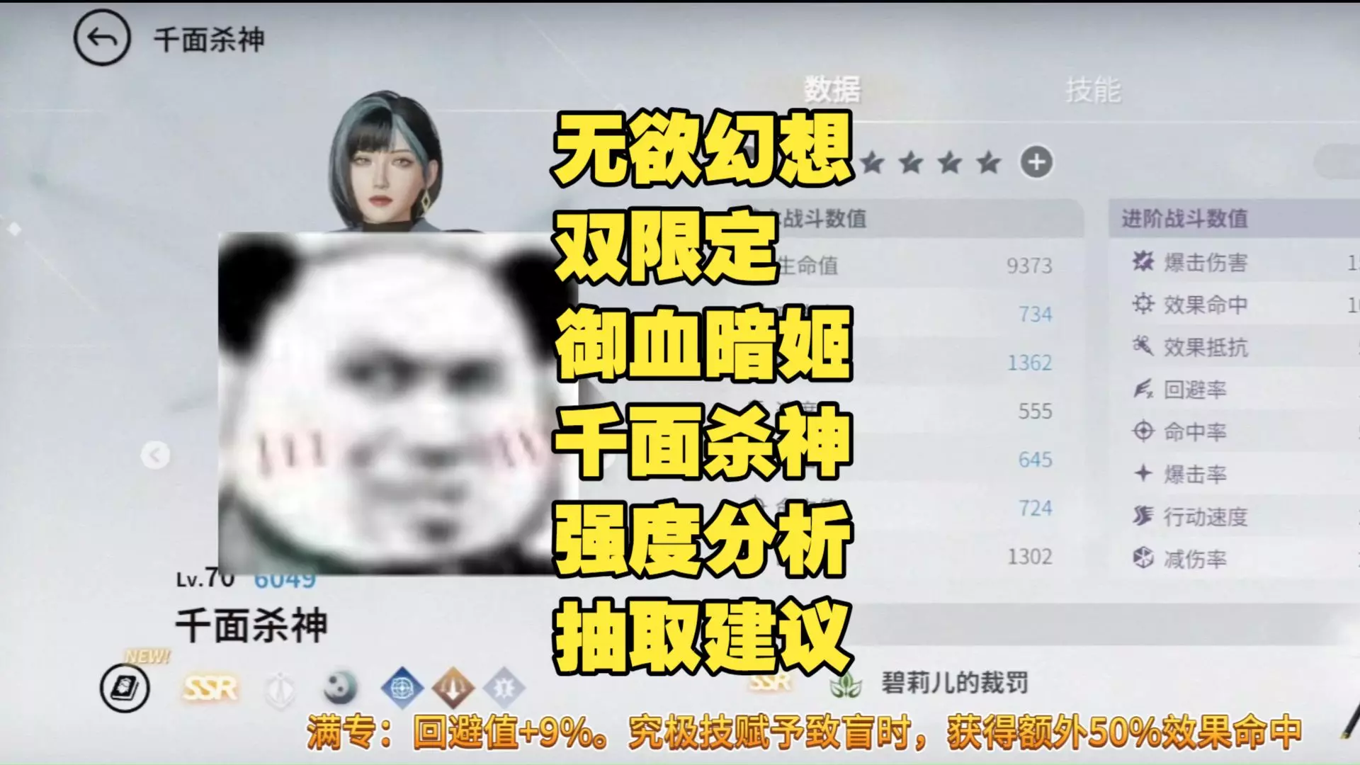 这是手游《欲神幻想》的杀手双限定解析内容,展示了SSR角色千面杀神、御血暗姬的属性面板与技能,解析了千面杀神的回避值、技能效果等,也提及御血暗姬的大招效果,为玩家提供角色培养参考。