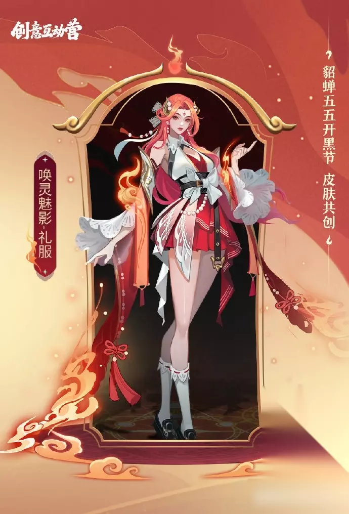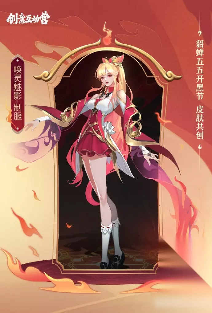 2022年五五开黑节皮肤共创投票中貂蝉胜出,将拥有2023年五五开黑节皮肤,该皮肤有制服、礼服两款方案,以现代奇幻校园风格为基础,融入火灵元素,兼具青春活力与东方幻想气质。