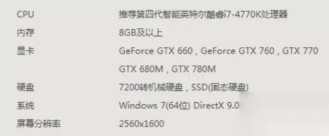推荐配置: CPU:inteli7 9代,ryzen 7 3代以上 内存:16GB以上 显卡:nVidia Geforce GTX 1060 6GB / AMD Radeon RX 570以 硬盘:100GB以上 系统:Win 10 64bit Directx:11