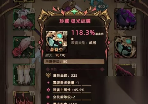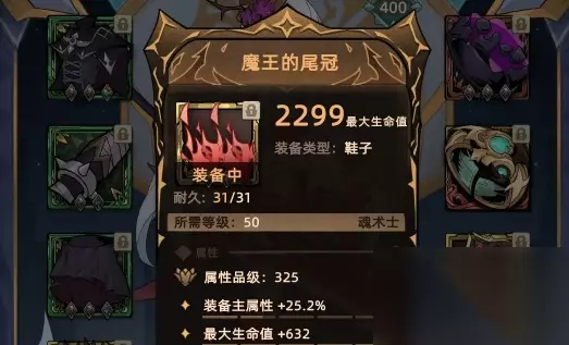 4、项链:亡魂,面板基础属性高,提高终极伤害。 5、头盔:幽暗武装,提高暴击和穿透。 6、鞋子:魔王的尾冠,提升最大生命和装备主属性。