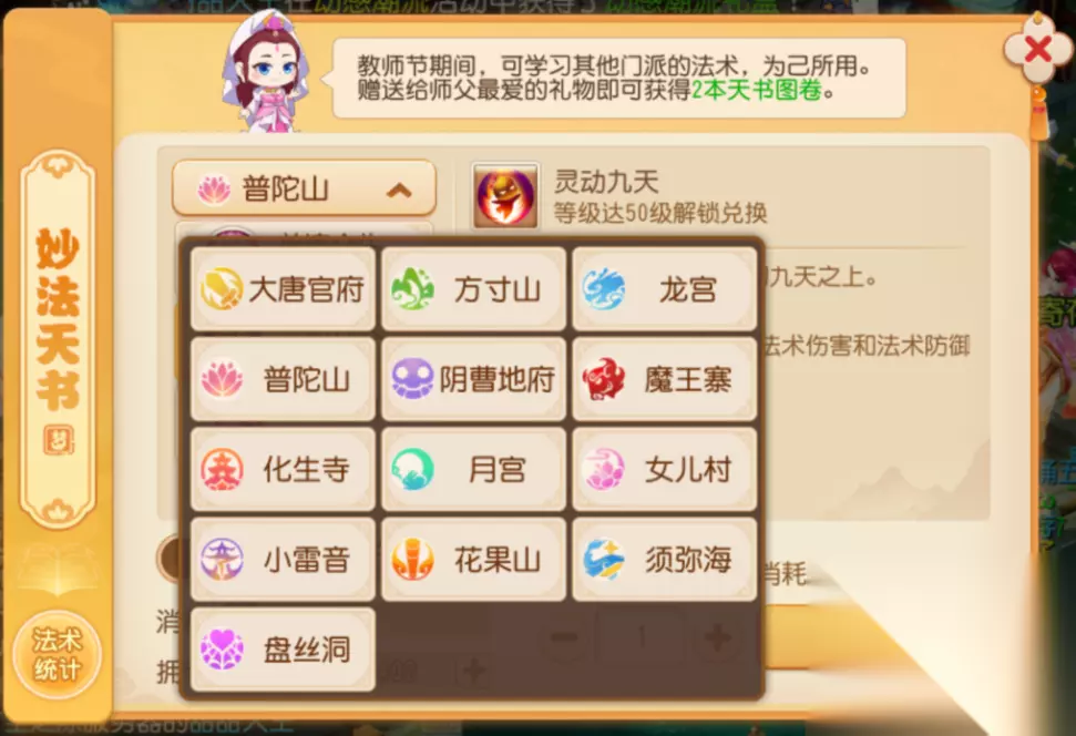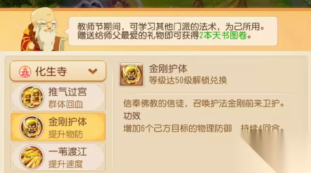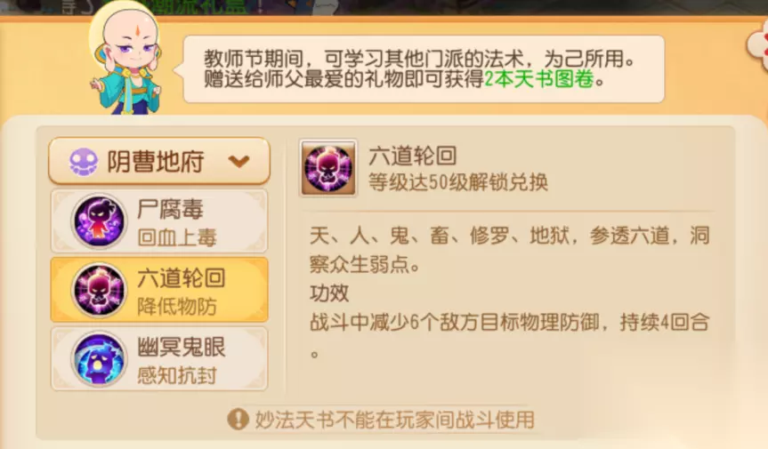 2. 补足增益 常规五门阵容往往需要在普陀山、化生寺、阴曹地府三个辅助门派中选其二。在教师节活动期间,各位少侠可通过妙法天书补足缺少的群体增益。 例如:选择普陀山、阴曹地府阵容的队伍可配置“金刚护体”妙法天书,补足物理抗性。