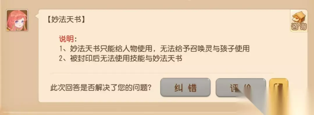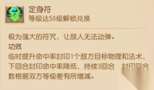 二、妙法天书使用小贴士 灵活使用妙法天书可扬长避短,大幅提高少侠怪物战斗的胜率,使用时记住以下几点可最大程度发挥其效用哦~ 1. 会被封印 妙法天书在类别上虽然属于“道具”,但依旧会受到失心符、定身符、一笑倾城、乾坤一掷、象形等封印类技能的影响,因此要注意被封印或可能被封印的情况。