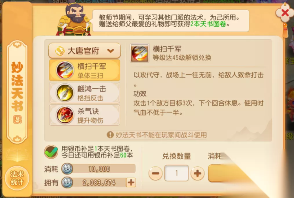 此外,妙法天书也可直接使用银币购买,每日最多可购置60本,单本售价为1万银币,各位少侠可按需采买。