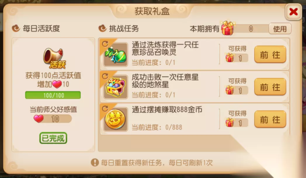 当师傅好感值达到一定数值后便可领取仙气、未鉴定的纹饰等实用道具。如果当日任务较难完成,少侠可以刷新一次哦。