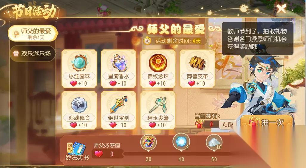 提到教师节活动,就少不了“妙法天书”这一神奇道具,有了它,少侠们就能在怪物战斗中使用其他门派的技能,好玩又给力!如何在本次活动中获取妙法天书,玩转妙法天书呢?灵儿现在就为大家细细讲解~ 一、活动攻略 完成教师节活动的每日任务可以收集各种礼物,将礼物赠送给对应的门派师父可以增加师父好感度并获得师父的回礼-天书图卷,用于兑换妙法天书。