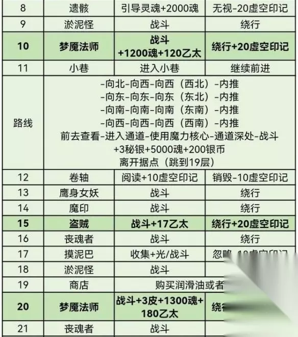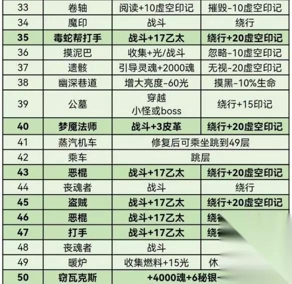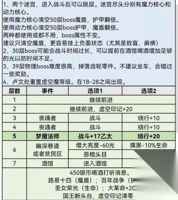 3、30层boss可能会战斗时间过长,可以提前在酒馆喝酒增加足够的光以防时间不足。39层物理boss难度很高,掉落齿轮零件。不建议坐车,会错过一些奖励。