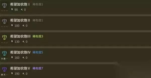 派生路线(点击名称查看武器详细数据图鉴) 希望加农炮Ⅰ→希望加农炮Ⅱ→希望加农炮Ⅲ→希望加农炮Ⅳ→希望加农炮Ⅴ→期冀加农炮。 武器数据 希望加农炮Ⅰ-Ⅴ