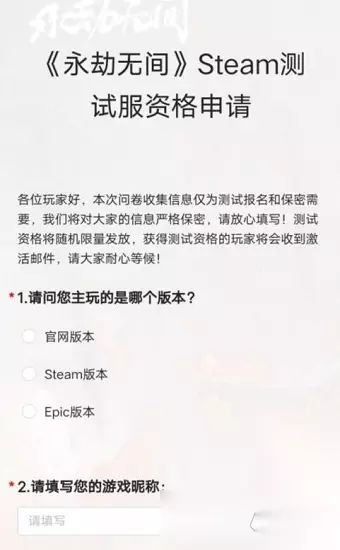 2、随后就能进入测试服资格申报填报栏,输入相关信息后待永劫无间官方审核就能获取测试服资格。