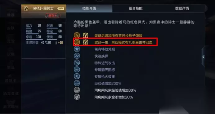 【装备推荐】既然是速刷,装备肯定非常重要,这里分享的技巧是:在进入对局前背包里可以装备一把M4A1-黑骑士,这把平民武器在挑战模式里暴击是有几率回血的,能大大节约我们的时间。