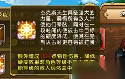 航海王启航技能效果图2 突破前技能的加强版,同样是开场释放,但附加威震使得敌人在受到普攻时也能受创,改技能对白胡子也是有效的,非常实用。这里需要提下雏菊和雷利的问题,雷利的3技能开场对突破杰克斯是有效的,杰克斯二技能释放时间太快,领先于雏菊开场大,所以遇到雷利时,杰克斯的二技能还是会未命中,同样配置新世界山智效果也是一样的。 技能效果如图: