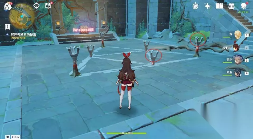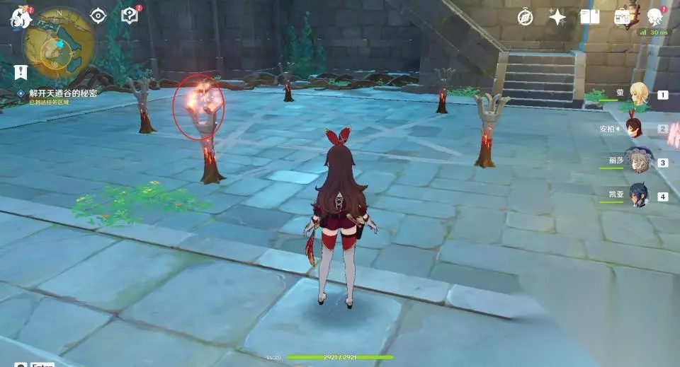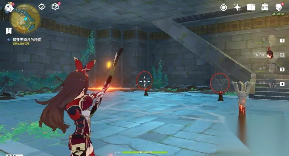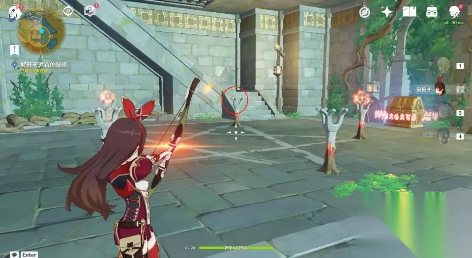 17、第一层石塔有六个火把,三个完全在地上,三个被埋了一半在地下,共两种状态的火把。两种状态各选一个,使用火元素攻击后点亮它们。