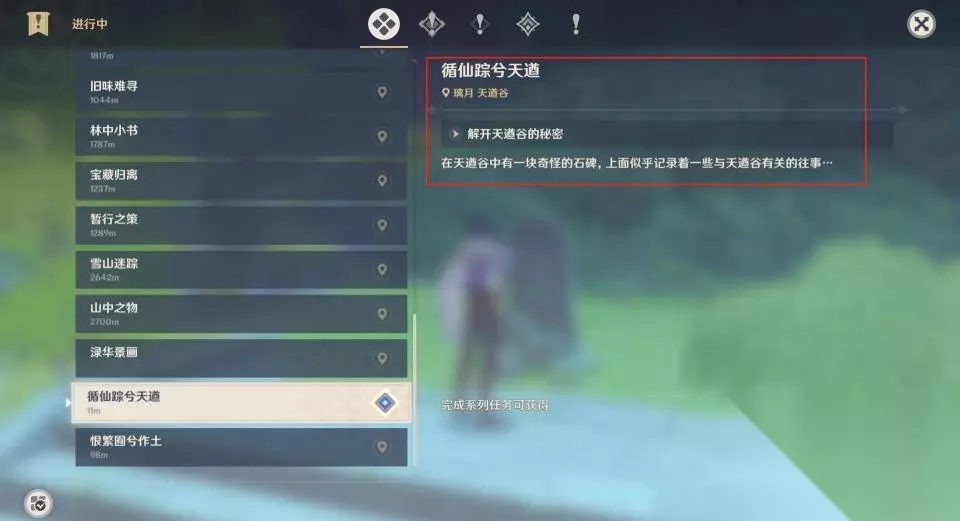 3、阅读碑文后会接到寻仙踪兮天遒的任务,任务要求解开天遒谷的秘密。