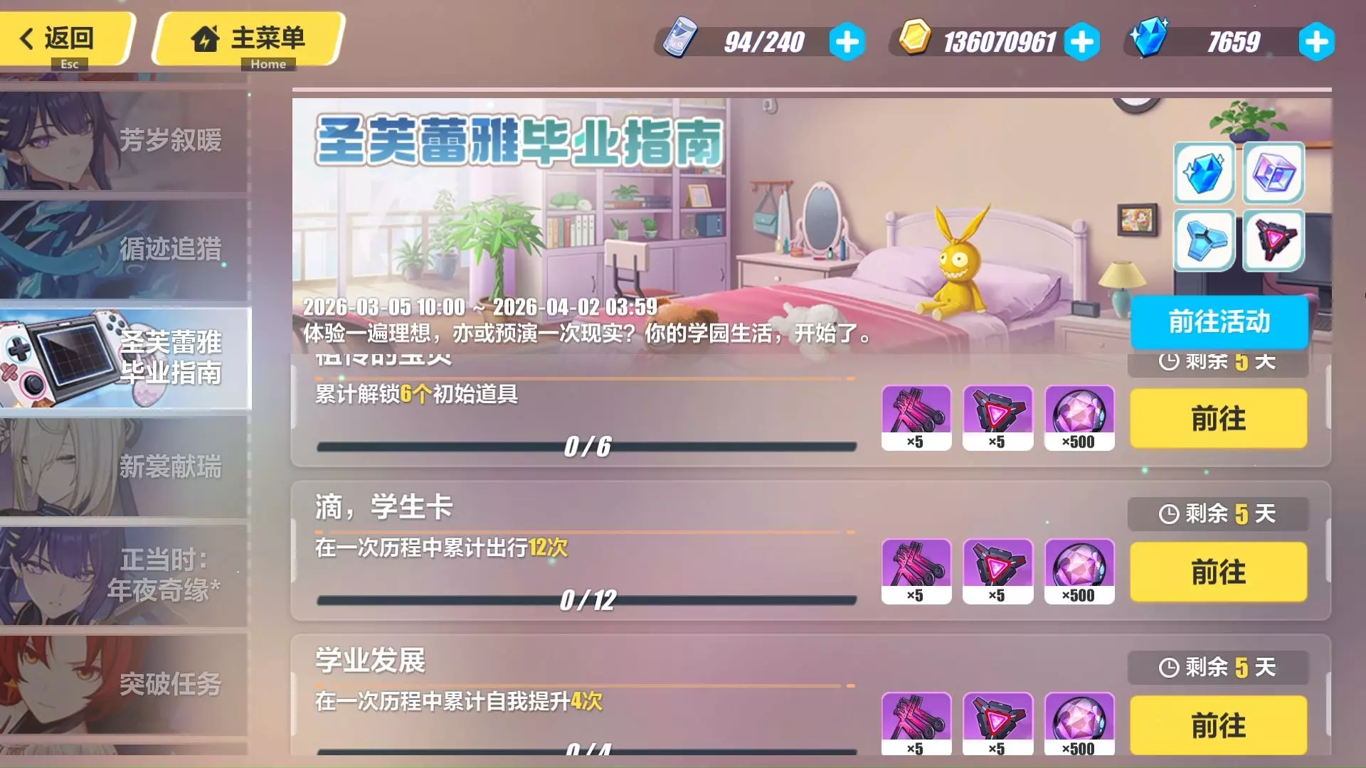 这是《崩坏3》8.7版本的「圣芙蕾雅毕业指南」活动内容,玩家可在活动中体验学园生活,通过选择不同行动、武器来提升属性,还有专业分流等阶段内容,活动目前处于更新中。