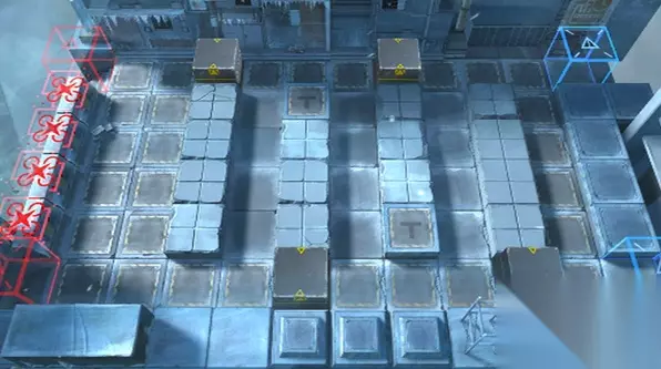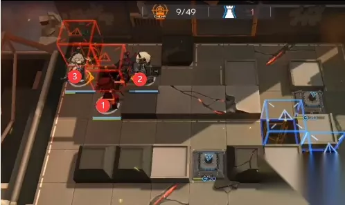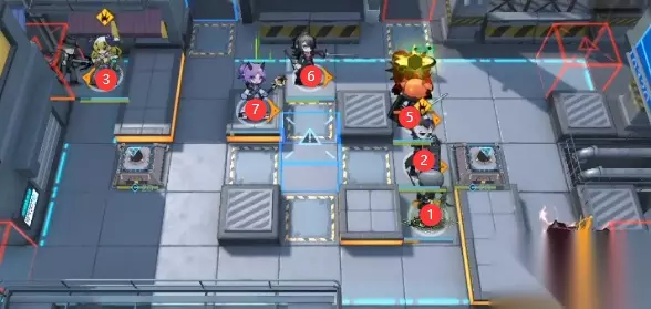 如下图所示,远程近卫(主要输出),然后在他身前放奶盾。 再之后左上和右下分别下群卫和挡1近卫堵门,然后奶盾前方重装挡无畏者并吸收仇恨防止装置被打。