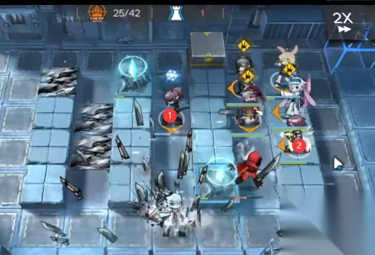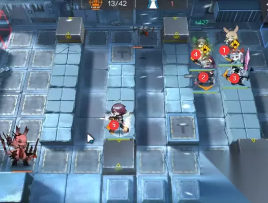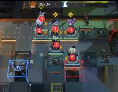 如下图所示,先下另一个单狙向下,配合群卫打小怪,再下单奶向左奶住,远卫辅助输出+提供阻挡。 霜星出现后下能天使,直接过载秒掉第一条命(输出不够就补一下其他输出)。打完直接撤退能天使。