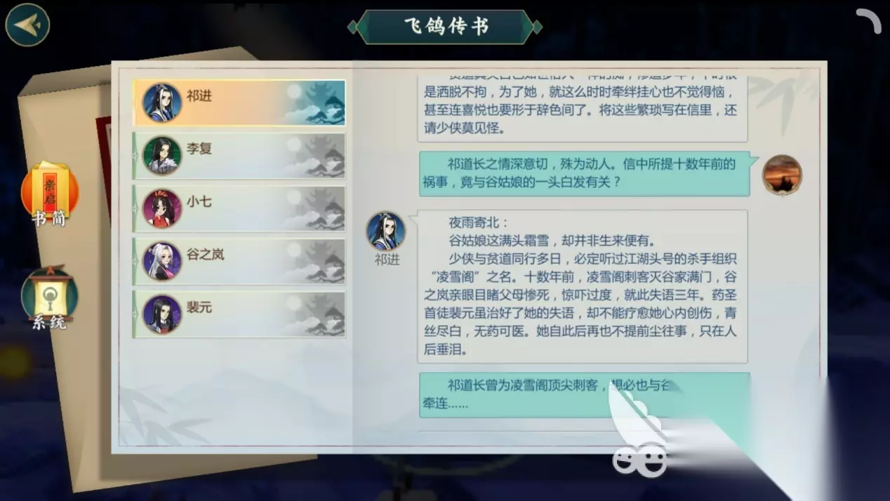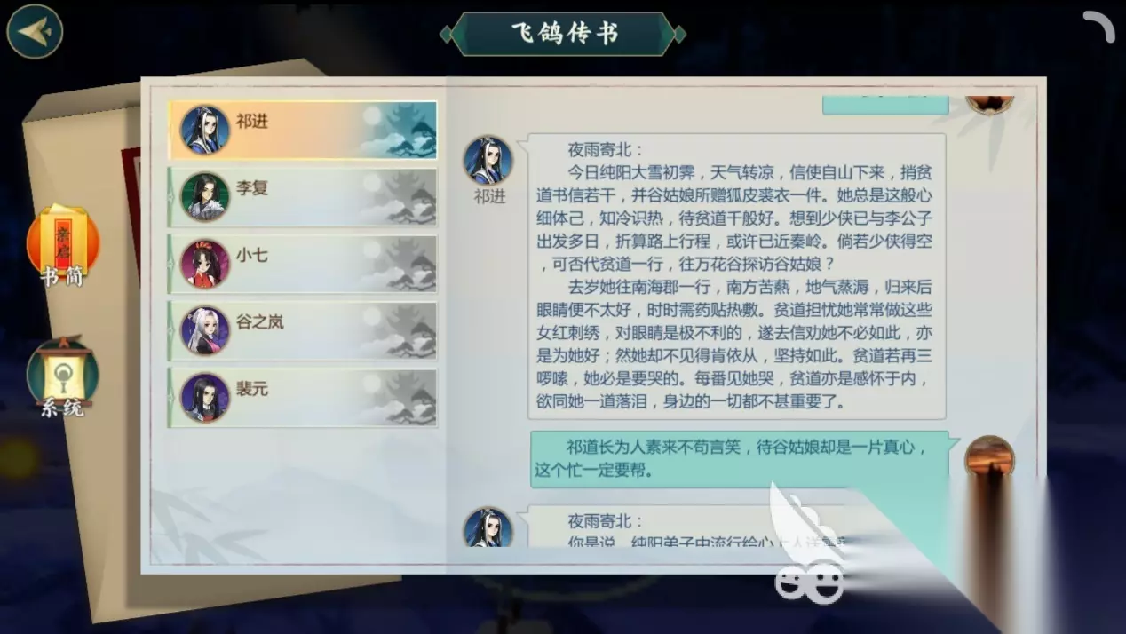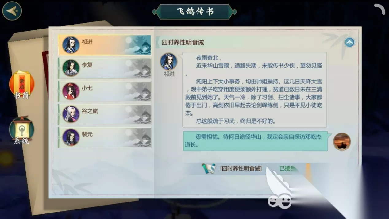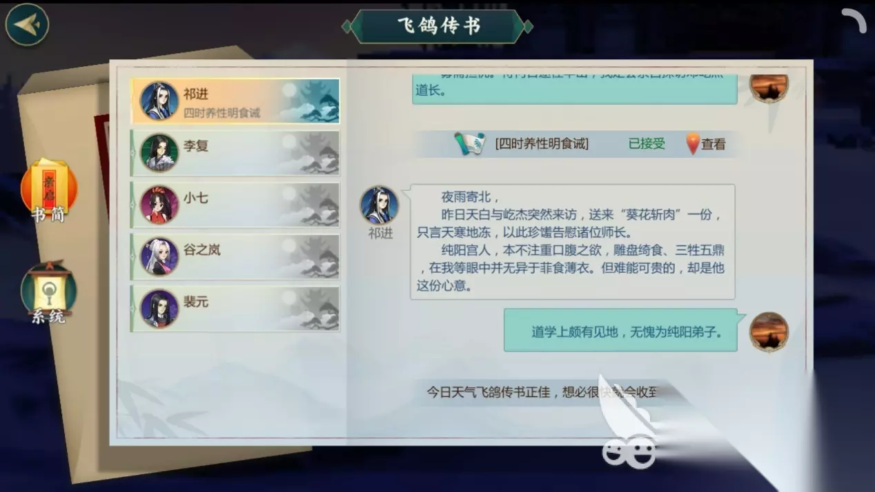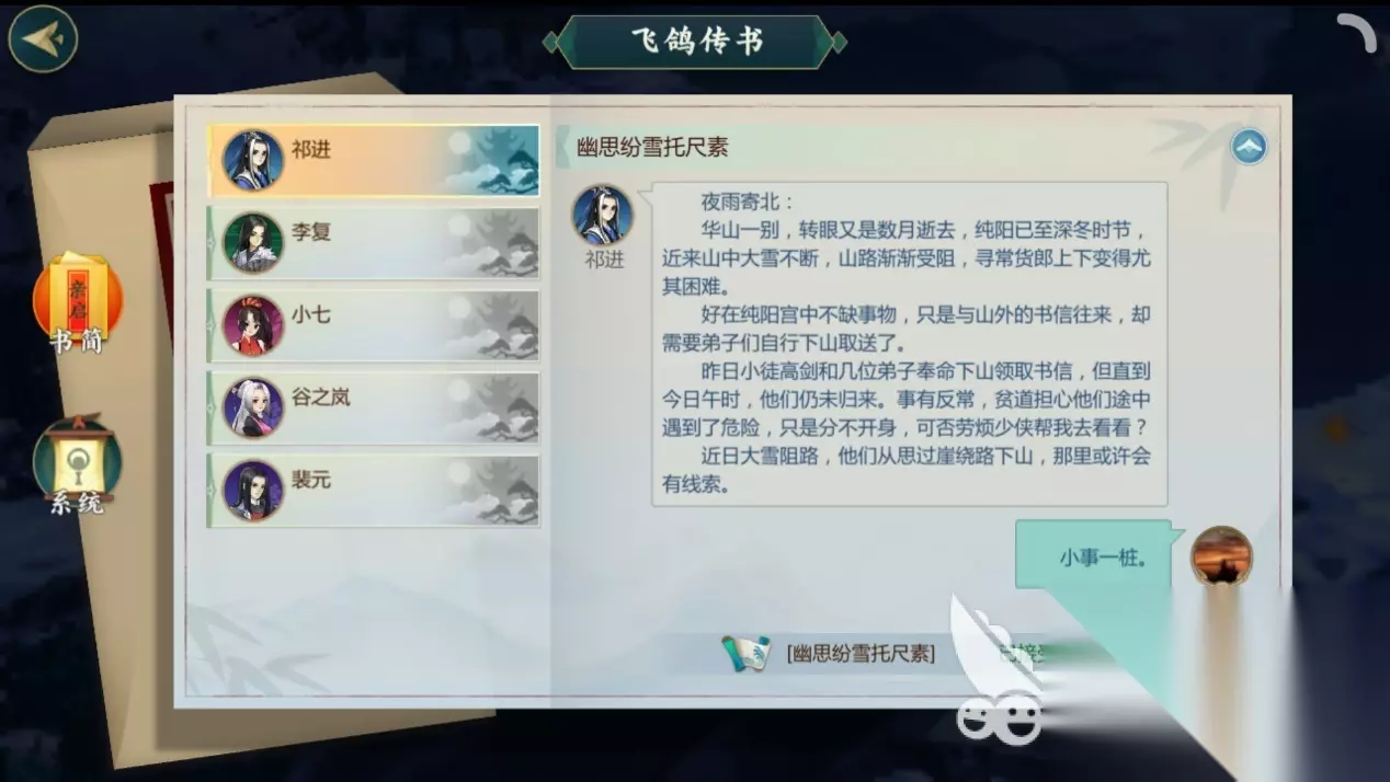 二、开始羁绊任务 话不多说,接下来跟着小编看,到底该如何开始祁进的羁绊任务吧! 在通关纯阳剧情第三章的前提下,玩家需要找到祁进npc并与他进行对话,接任务后根据系统指引,前往纯阳的思过崖找一封信。记得开心眼!开心眼!开心眼!重要的事情说三遍!如果不开心眼,就算系统提示任务地点到达,玩家也看不到信在哪。 围绕信的任务一直做下去,然后就耐心等待祁进的来信,开启羁绊任务。 任务一:幽思纷雪托尺素