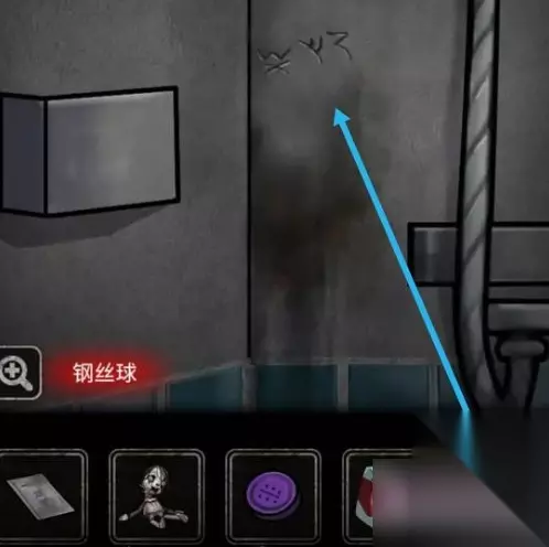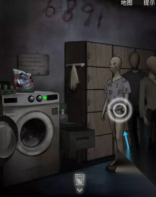 离开浴室,地上有一根绳子,墙上写着密码,1689打开洗衣机,排水获得模特的假手和衣服