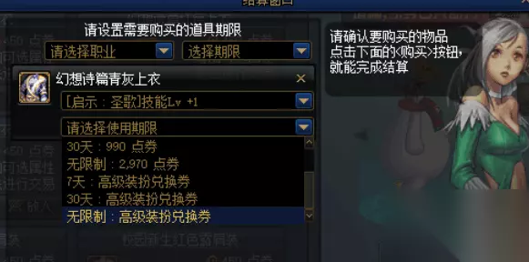 DNF高级装扮兑换券使用方法 1.首先点击右下角的商城按钮,或者按下F5键,进入商城。 2.点击装扮界面,找到自己想购买的时装。 3.点击购买时装,然后会弹出选择属性和支付的选项,选择好了属性之后往下面拉,会看到使用期限选择,就是支付的选项了,找到最下面的后面带有“高级或普通装扮兑换券”然后按照对应期限选择它就可以了。 DNF2020活动 欲望之塔