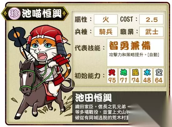 池田恒兴,日本战国时代至安土桃山时代武将。池田恒兴的父亲很早就过世,母亲成为织田信长的乳母,后来又成为织田信秀的侧室,因此恒兴跟信长自幼一起长大,成为信长非常信赖的家臣,在桶狭间之战、姊川之战…等大小战役中立下许多战功,被封为犬山城城主。火属性的‘池喵恒兴’,其代表技能‘智勇兼备’,可使攻击力与策略提升。 不破咪治(珍)