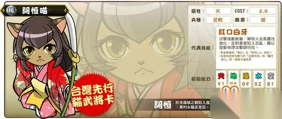 阿恒,战国时期武将奥村永福之妻。奥村家世代皆仕奉于前田家,在奥村永福担任‘末森城’城主一职期间,碰上越中国主佐佐成政率兵攻打,当时孤立无援的奥村永福率领千馀守军奋力抵抗,其妻阿恒巾帼不让鬚眉,在战局最危急的时刻,手持长刀披甲亲自上阵,往来鼓舞守城方的士气。城中诸将的妻室也全组织起来,照顾伤兵,并向城头输送饮水和饭食,终于盼得援军到来,击溃佐佐军获得胜利。火属性的‘阿恒喵’,其代表技能‘红口白牙’,能同时攻击多个敌人,自身的攻击力越高造成的伤害就越大。 全新超强猫武将作战力up up 阿市喵 (煌)