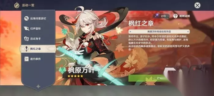 这把武器并不是制造获得的,也不需要大家去购买,他出现在万叶的2.8版本传说任务中,小伙伴们使用两把钥匙就可以解锁枫红之章了,接受后大家要前往稻妻的绀田村,进入绀田村后你们发现附加的村民有点不太对劲,突然出现了一个陌生武士,这个武士拿着一把散发紫光的刀向你冲来了,大家在和他交手一段时间后,武士就会离开,在离开前他会说你们应该不认识万叶,为了调查这个人的身份,你们要去九条屋府去寻找万叶,此时的万叶正在和九条家主对话,在万叶了解了这些事情后,于是便开始寻找这个武士了。