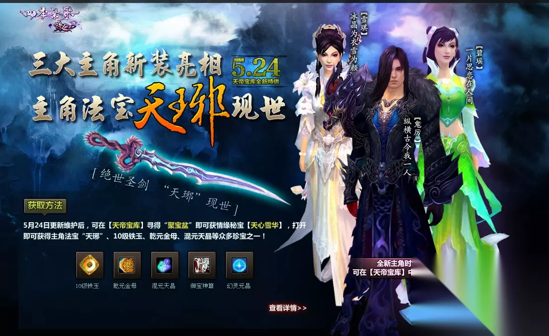 新的法宝 新的时装 第二个新的主角法宝天琊现世,5.24日更新维护后,可在天帝宝库寻得聚宝盆获得天心雪华,打开就可以获得主角法宝天琊、10级铁玉、乾元金母、混元天晶等众多珍宝之一,另外第二版的主角时装上架。