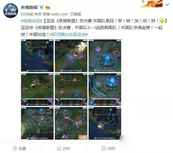 2018年雅加达亚运会LOL决赛第四场比赛已经结束了,中国队以3:1的比分战胜了韩国队,获得了冠军。央视新闻官博也在第一时间送上了祝福。