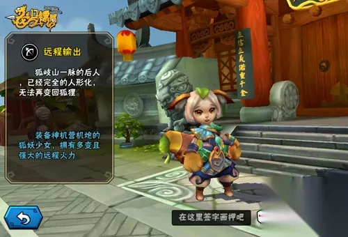 角色名称:小妖狐 角色背景:来自大明神龙突击队,经过各种特殊极限的训练,对各种火器使用纯熟。外貌虽是一个小萝莉,其身份已经是神龙突击队小队长。 角色装备: Mark-44重机枪 浣溪纱 浣花靴 沉香镂金囊 角色技能: 1.量子激光炮:使用激光炮攻击直线上的敌人,造成物理伤害。 2.鲨鱼铅弹:进场时向空中发出多枚鲨鱼铅弹,落下时将目标砸晕,数秒后铅弹会爆炸,对周围的敌人造成物理伤害。 3.次时代枪械:使用次时代武器强化火力,永久增加自身物理攻击。 4.超级榴弹炮(大招):使用榴弹炮进行5次攻击,对目标及周围的单位造成大量物理伤害。