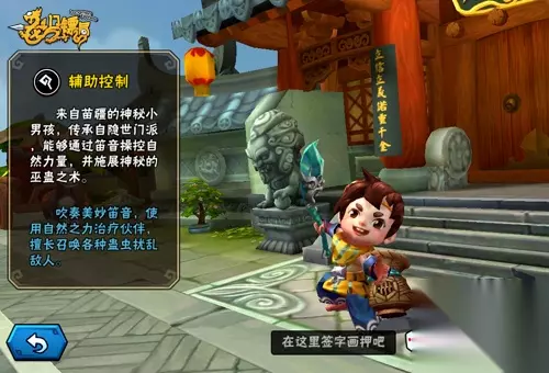 角色名称:正太 角色背景:来自苗疆,使用蛊术的小正太。 角色装备:幻音短笛 浩然衣 软藤履 桃木笄 角色技能: 1. 花飞蝶舞:释放数只彩蝶治愈队友的伤口,恢复部分生命值。 2. 千劫毒蜂:施放大量毒蜂持续攻击敌人,造成魔法伤害。 3. 魔龙金蛊:永久增加自身魔法攻击力。 4. 蟒枯朱蛤(大招):召唤一只巨型蟒枯朱蛤帮助战斗。