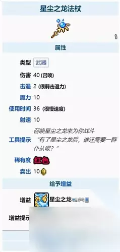 泰拉瑞亚是一款开放世界冒险为背景的沙盒生存探索游戏,玩家在游戏中将会操控主人公角色在这个庞大的沙盒世界中自由的进行冒险探索,收集各种物资道具,进行装备的合成打造,击败各种强有力的怪物种类。泰拉瑞亚游戏中的职业类型非常的丰富,特别是法师这个职业,不仅具有高爆发的伤害还是可以远程攻击的职业,在游戏中还是比较吃香的,操作手法在好一点,各种游戏boss都能够轻松挑战,游戏中的星尘之龙法杖玩家在使用后便可以召唤星尘之龙协同作战,大大提升玩家的战斗能力,许多玩家还不是很清楚星尘之龙法杖怎么合成,下面就由小编给大家分享泰拉瑞亚星尘之龙法杖合成方法攻略,感兴趣的小伙伴们快来一起看看吧。 泰拉瑞亚1.4.4下载 类型:休闲益智 大小:260.7M 语言:简体中文 评分: 查看详情 泰拉瑞亚星尘之龙法杖合成方法攻略: 在泰拉瑞亚游戏中,玩家需要使用18个星尘碎片在古代机械组装者处合成星辰龙法杖。 星尘龙权杖属红色武器,基本伤害值60,基本魔耗10,使用间隔36。 使用星龙法杖后,玩家可以召唤星尘龙协同作战。