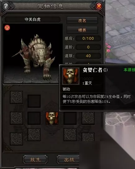 守关白虎: 高富帅必备出门利器,其本源技能属于回血技能,适合出招速度很快的职业,如移动玉狐、罗刹跟龙女,对于猴子来说一般,看个人需求。