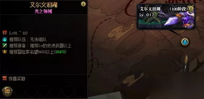 dnf艾尔文泪湖要怎么打 副本介绍: 艾尔文泪湖分为四个区域,一共100层,类似于爬塔的进攻方式,击败每层的BOSS后就可以进入下一层并恢复部分HP、MP,不过如果通关了最后一个区域光之领域后,其余的阶段就无法再次进入,所以如果想要每周拿满奖励需要从最底层黯黑之领域进行攻略。