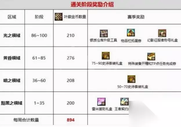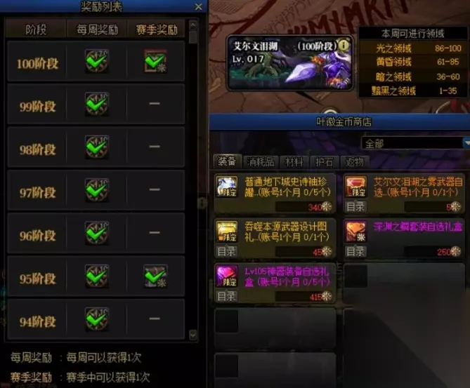艾尔文泪湖赛季奖励多久一次 艾尔文泪湖赛季奖励有两种,一种是常规奖励每周可以获得一次;一种是赛季奖励,只能获得一次,在首次通关时获得。 具体奖励如下: 1-35层:每周200叶徽金币+一次性雷米援助礼盒、王者契约(3天)、圣物装备套装、复活币x3 36-60层:每周208叶徽金币+一次性50~70史诗套装礼盒 61-85层:每周276叶徽金币+一次性75~90史诗套装礼盒、特殊装备开槽和TP点任务完成券 86-100层:每周210叶徽金币+一次性银质仓库升级工具、物品栏扩展券、幻影征服者称号礼盒 奖励介绍: PS:以上奖励是累积的,例如我们达到了60层,就能获得1-35层和36-60层的奖励。