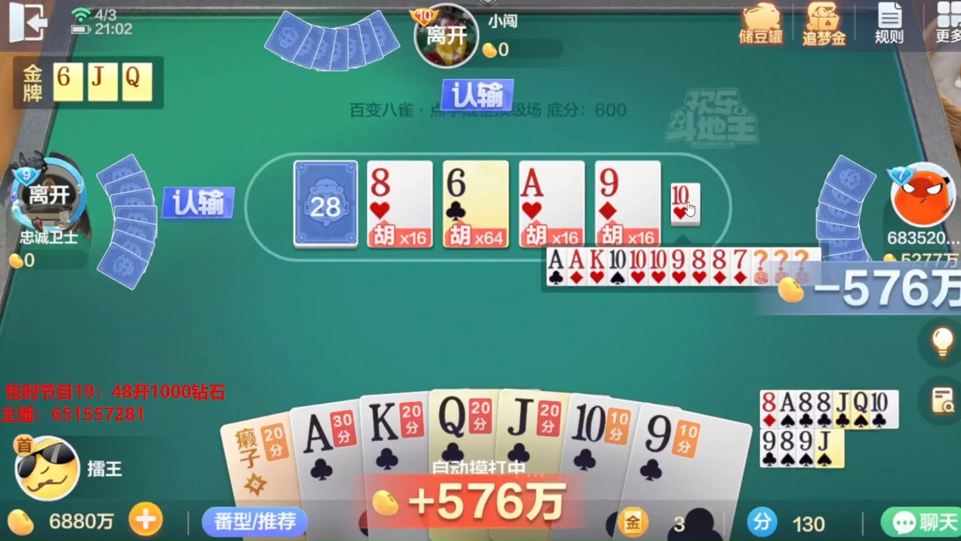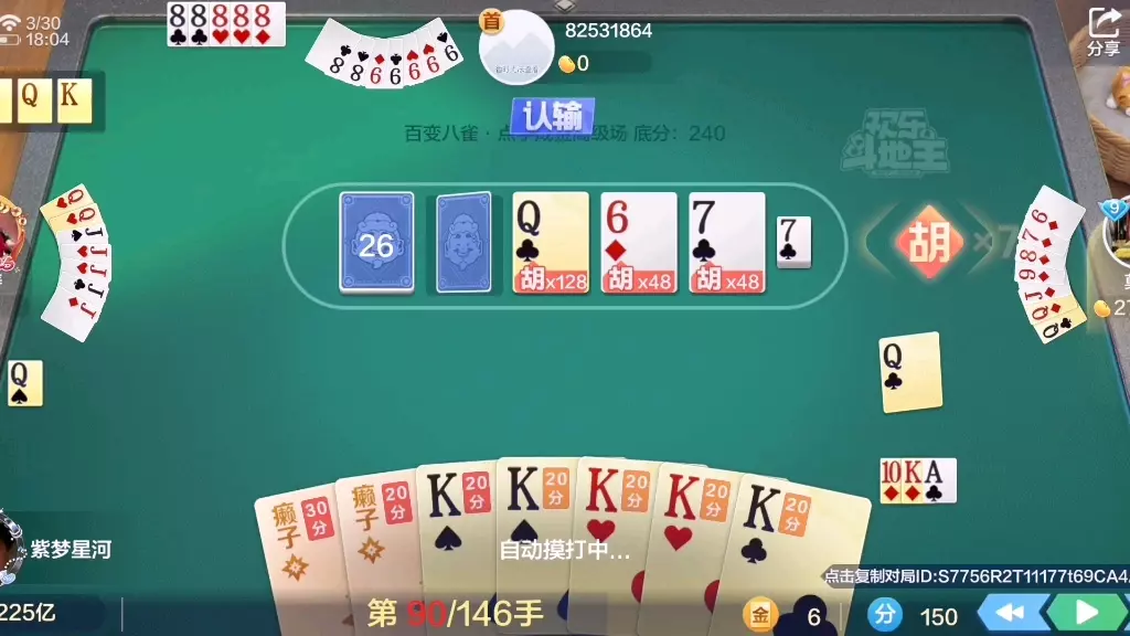 欢乐斗地主百变八雀牌顶级场再次出村,两家互卡,爽赢1.2亿欢乐豆。