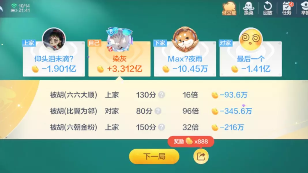 玩家在欢乐斗地主百变八雀牌顶级场的对局中,凭借胡牌六六大顺、两次八方来财,狂揽1.002亿欢乐豆,对家则损失近1亿豆子,展现了精彩的牌局对战。