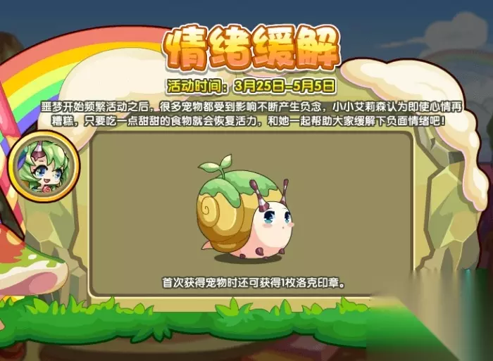 《洛克王国》小小艾莉森获取方法 情绪缓解 噩梦开始频繁活动之后,很多宠物都受到影响不断产生负念,小小艾莉森认为即使心情再糟糕,只要吃一点甜甜的食物就会恢复活力,和她一起帮助大家缓解下负面情绪吧! 活动时间:3月25日-5月5日 活动地图:艾美特山岭 活动获得:小小艾莉森,洛克印章