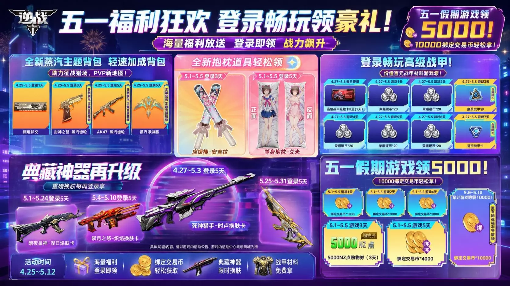 逆战五一假期推出多重免费福利活动,玩家可通过登录、游戏等任务,领取艾米抱枕、4款典藏神器换肤卡、两万绑定交易币、5000NZ点购物券、战甲10连抽等奖励,还有蒸汽主题换肤、移速加成背包可获取。