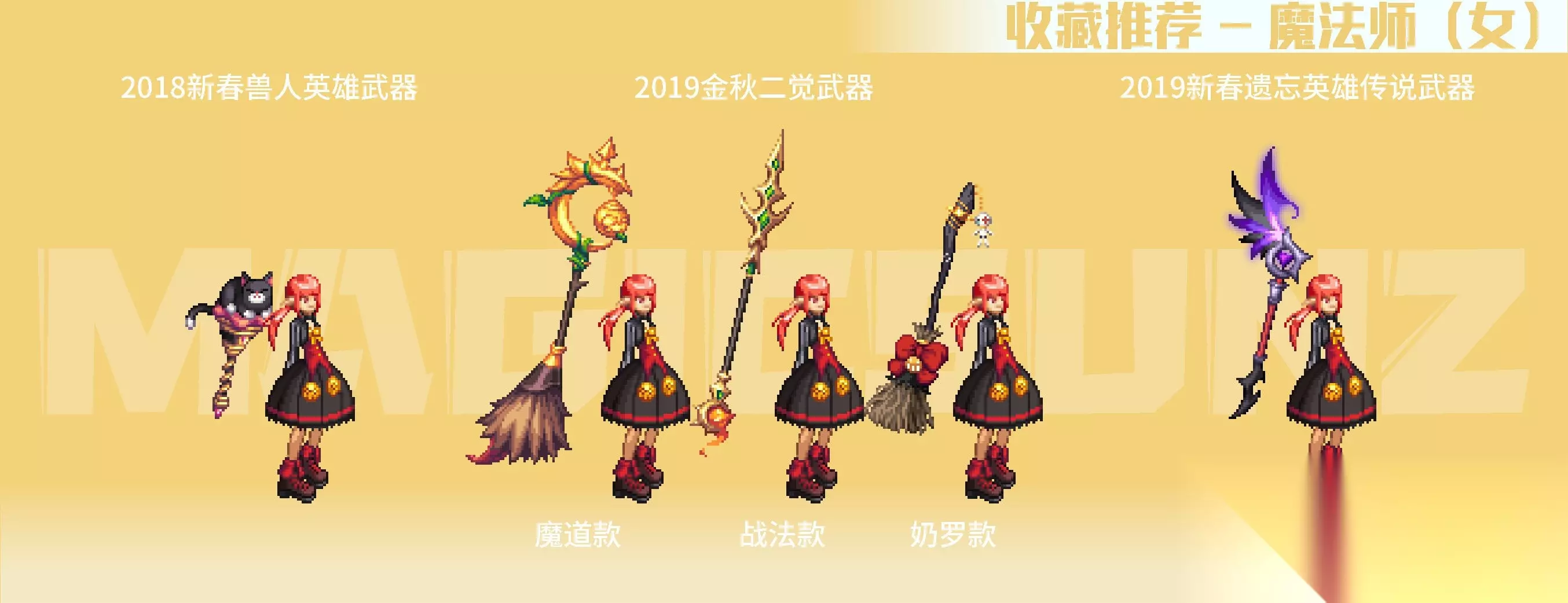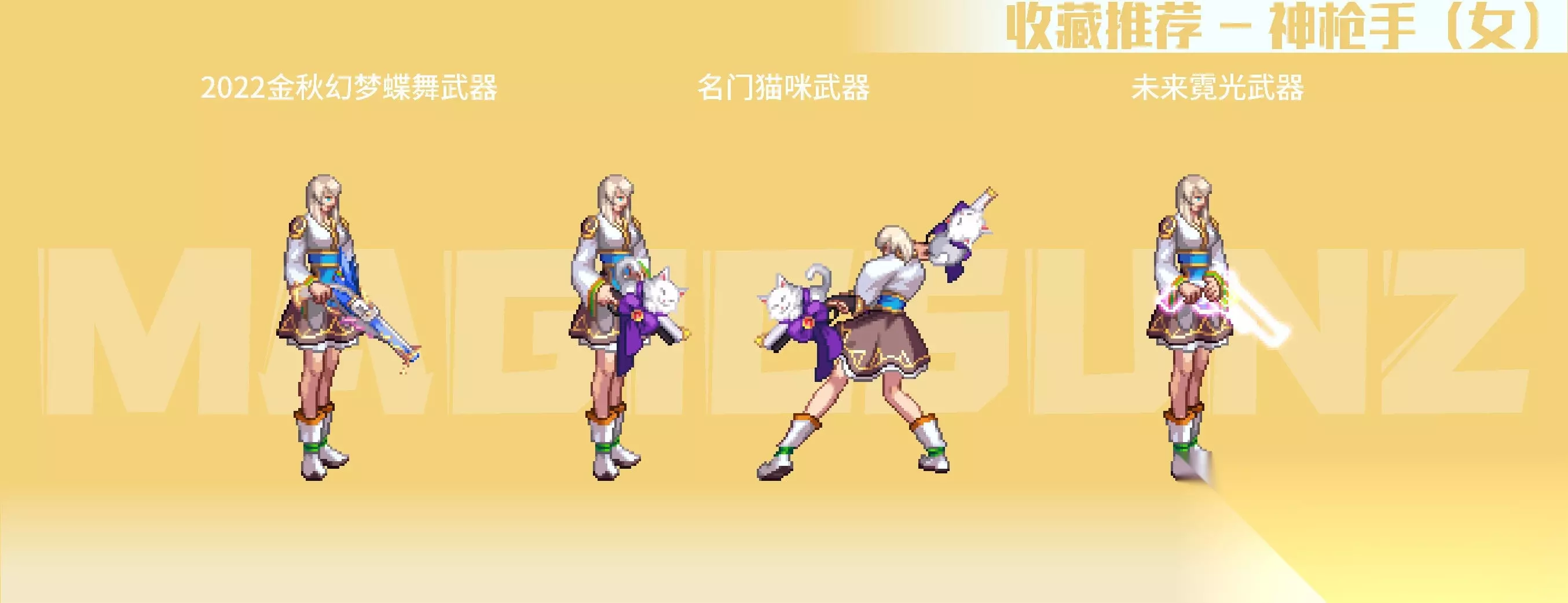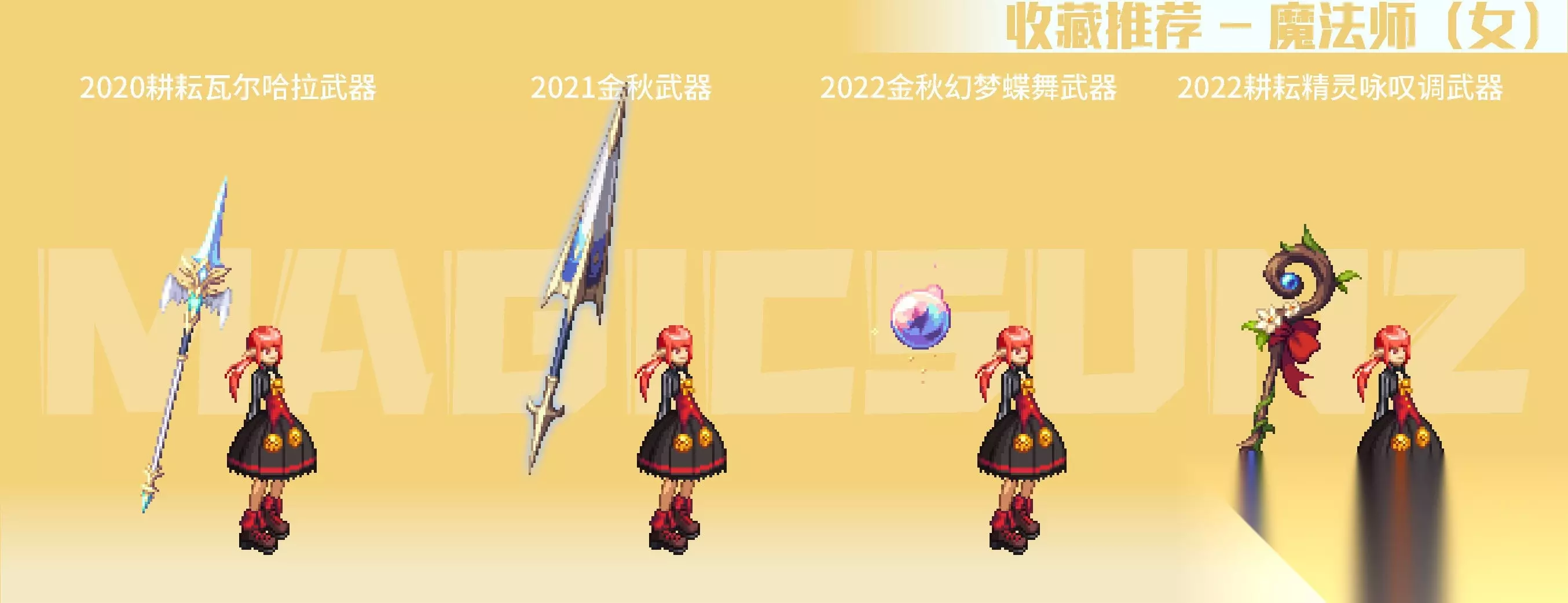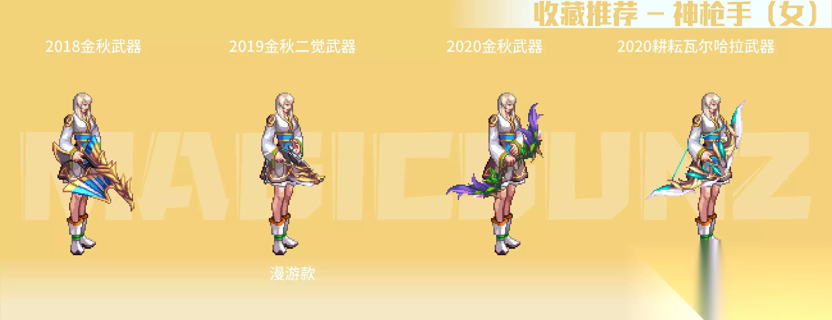 【简评】 女枪手的各类手弩武器装扮,相较于男枪手系还是更具美感的,手弩较大的点阵面积,也容易有比较特色的绘制成果。女枪手职业的二次觉醒装扮中,相对而言比较推荐漫游款,比较简练百搭,其他职业系款式视情况收藏。 2018金秋武器装扮,带一定埃及要素的埃及鸟形手弩比较有特色,推荐收藏;2020金秋武器装扮,是花女王主题的COS弓弩,武器整体以植物为主要元素,绘制很有生态动感,除色系比较艳丽,是非常优质的武器装扮;2020耕耘瓦尔哈拉武器,白色羽翼弓弩有弓弦绘制,形式上有些类似弓箭手职业。女枪手的名门猫咪武器,是自动步枪+点缀丝带+趴猫的组合,动物要素在枪身上,比较有玩偶装饰感,造型很优秀,推荐收集。 霓光武器装扮为灯管左轮造型,枪身简单朴素,稍微有点类似于男枪的高人气武器装扮“麦吉风暴”,在搭配上空间十足,也是很推荐收藏的武器装扮。 四、魔法师(女) 【推荐装扮】