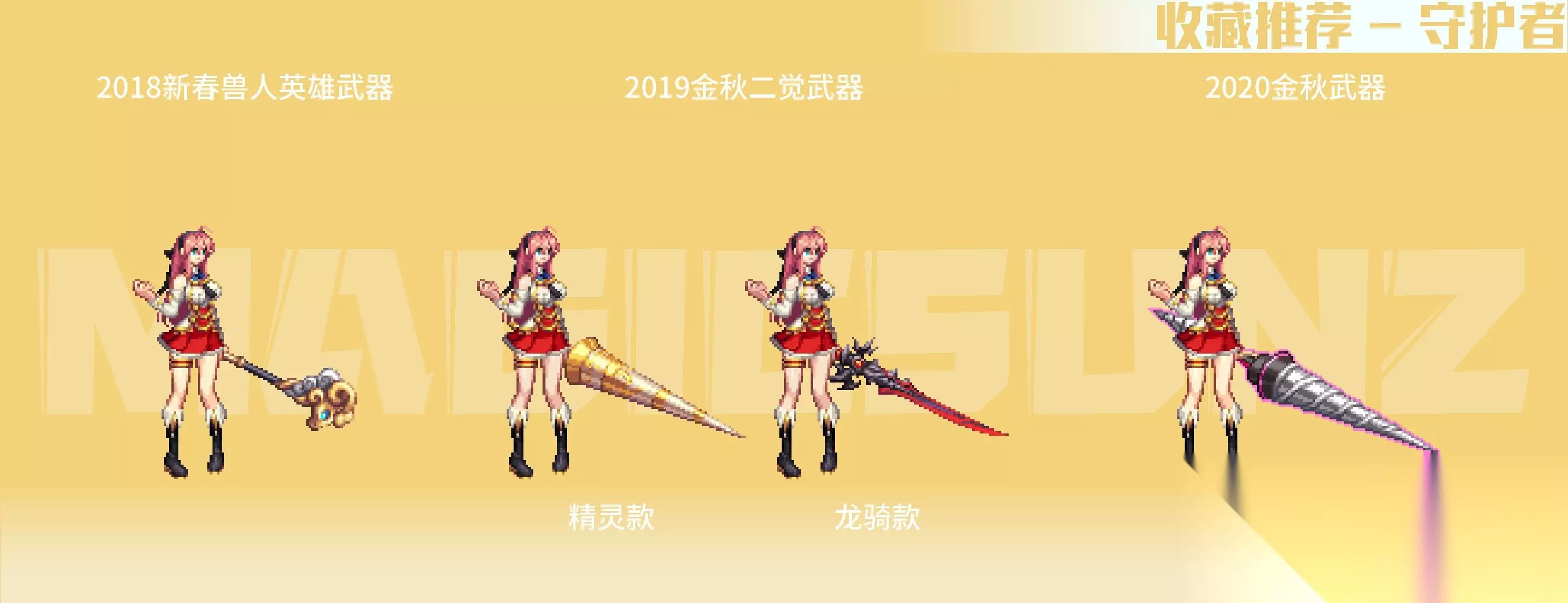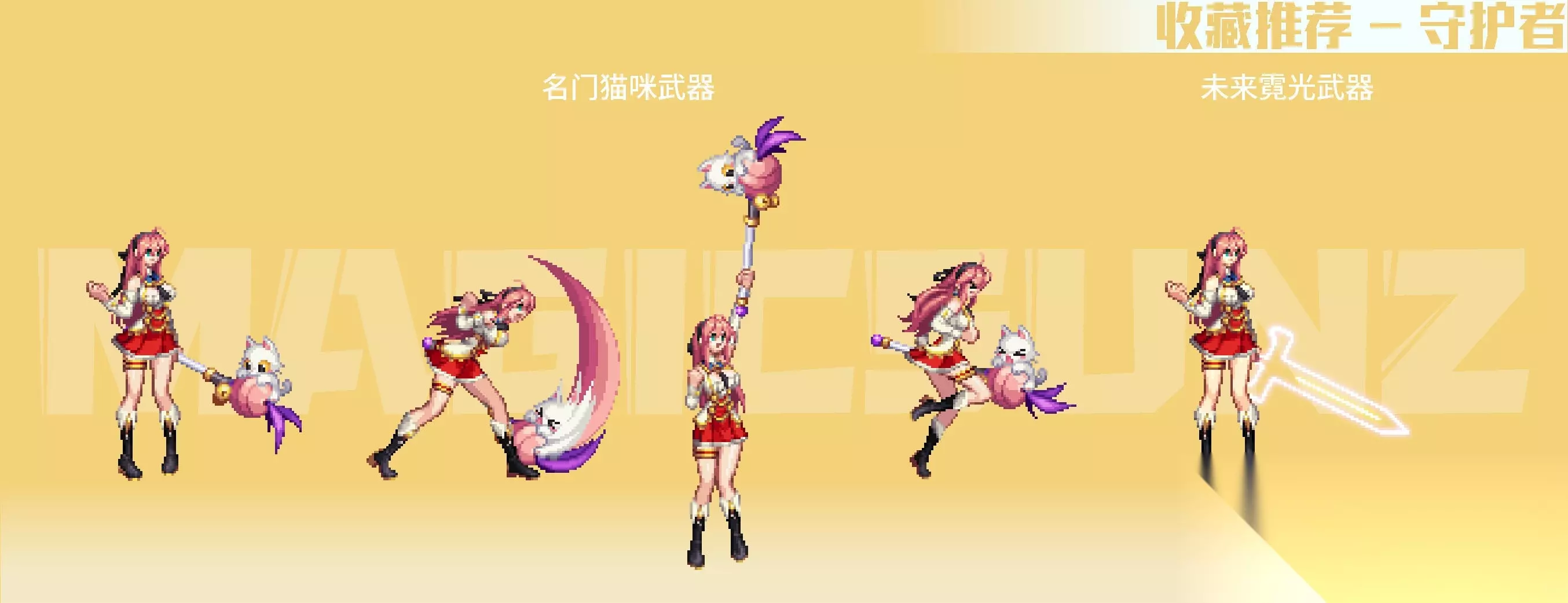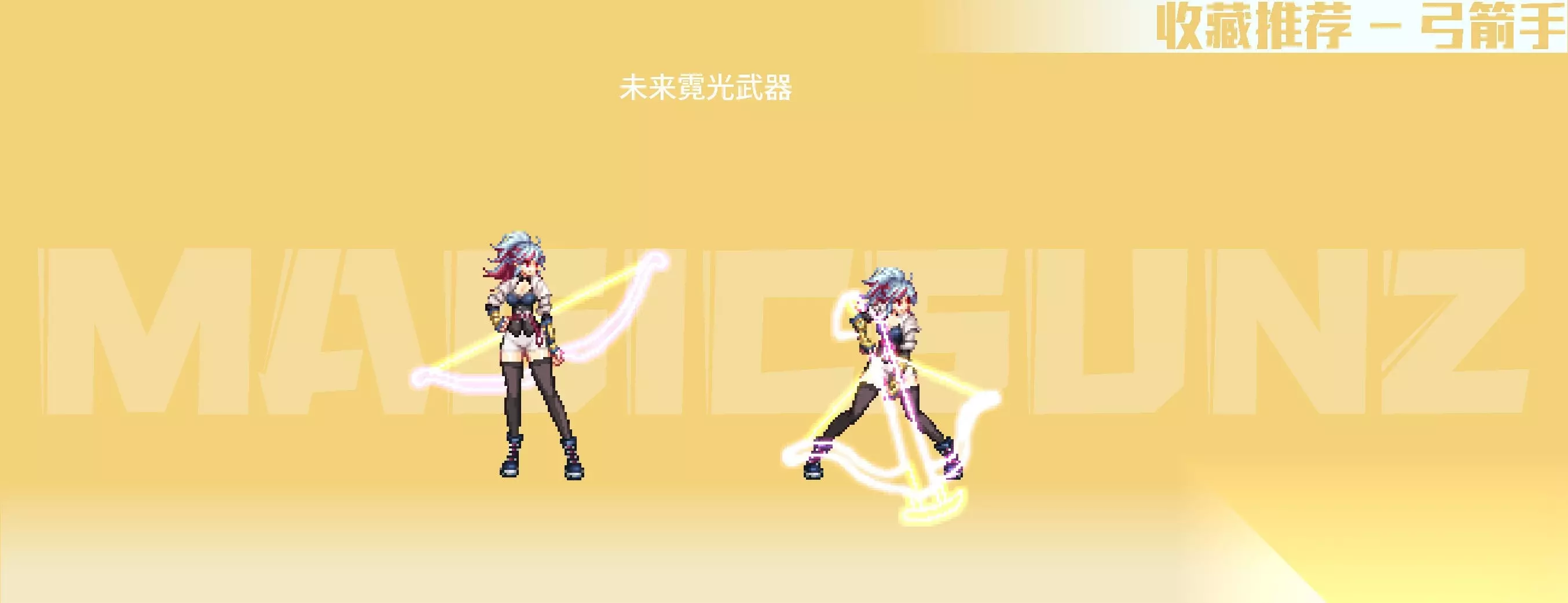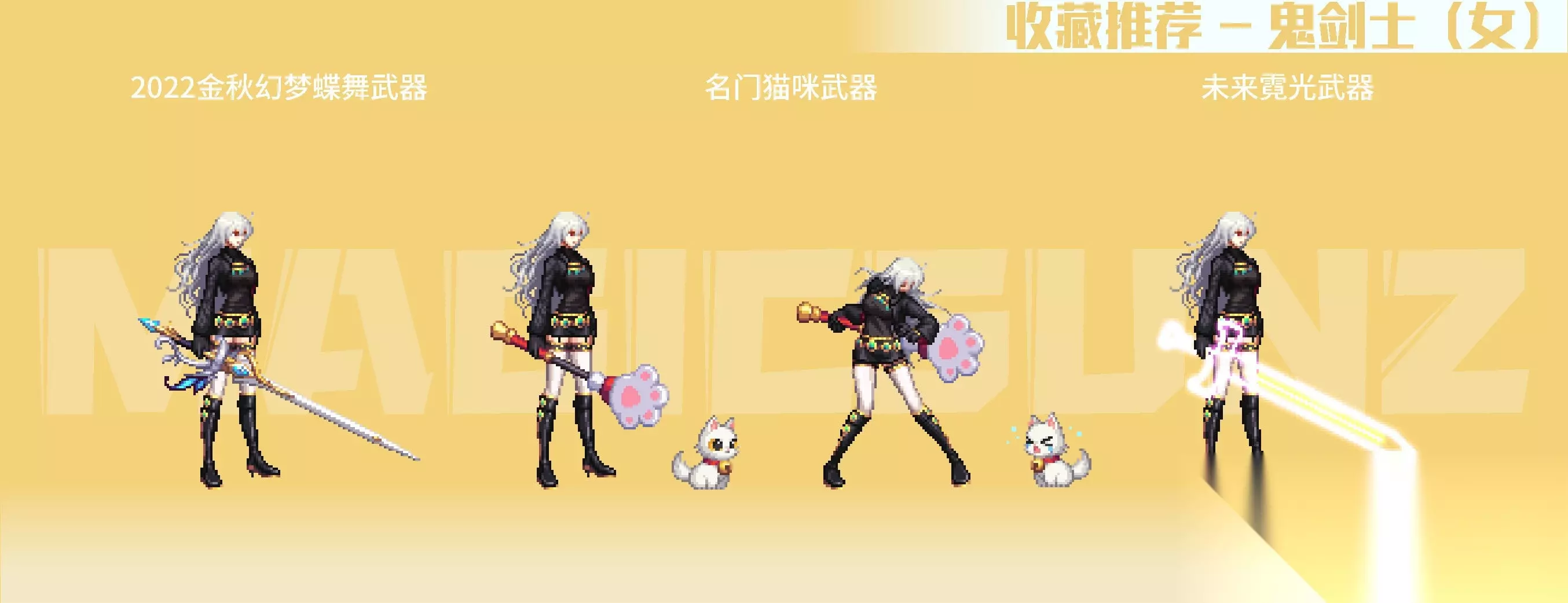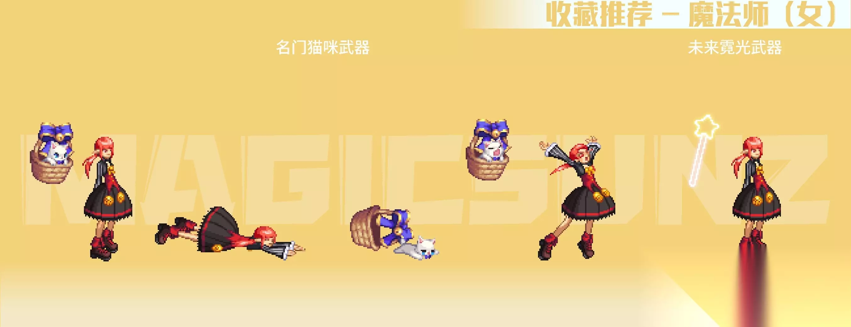 【简评】 女枪手的各类手弩武器装扮,相较于男枪手系还是更具美感的,手弩较大的点阵面积,也容易有比较特色的绘制成果。女枪手职业的二次觉醒装扮中,相对而言比较推荐漫游款,比较简练百搭,其他职业系款式视情况收藏。 2018金秋武器装扮,带一定埃及要素的埃及鸟形手弩比较有特色,推荐收藏;2020金秋武器装扮,是花女王主题的COS弓弩,武器整体以植物为主要元素,绘制很有生态动感,除色系比较艳丽,是非常优质的武器装扮;2020耕耘瓦尔哈拉武器,白色羽翼弓弩有弓弦绘制,形式上有些类似弓箭手职业。女枪手的名门猫咪武器,是自动步枪+点缀丝带+趴猫的组合,动物要素在枪身上,比较有玩偶装饰感,造型很优秀,推荐收集。 霓光武器装扮为灯管左轮造型,枪身简单朴素,稍微有点类似于男枪的高人气武器装扮“麦吉风暴”,在搭配上空间十足,也是很推荐收藏的武器装扮。 四、魔法师(女) 【推荐装扮】