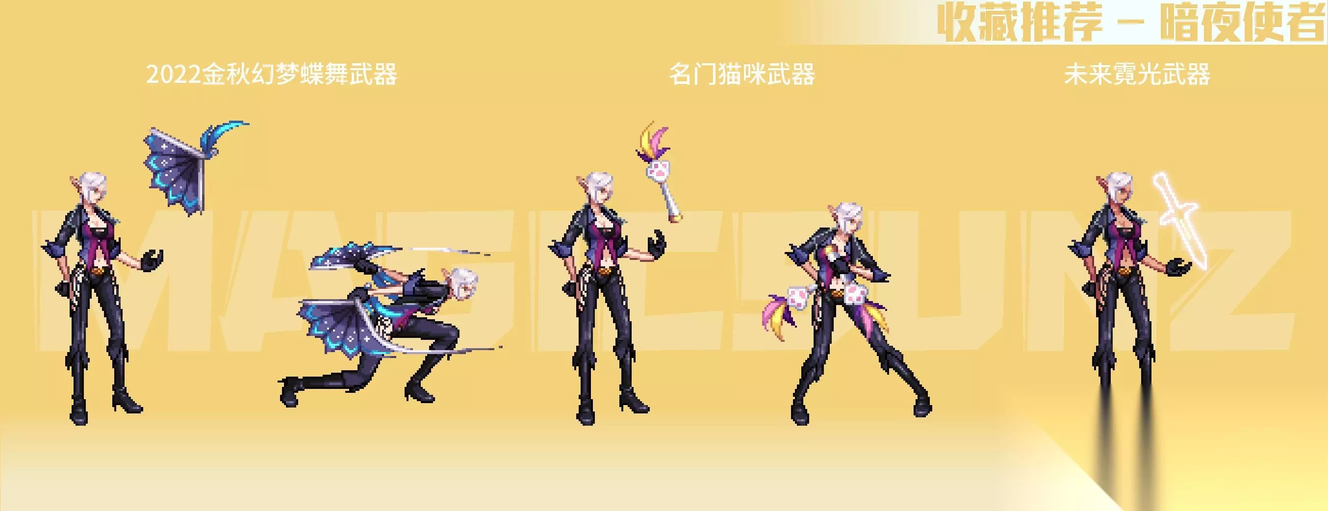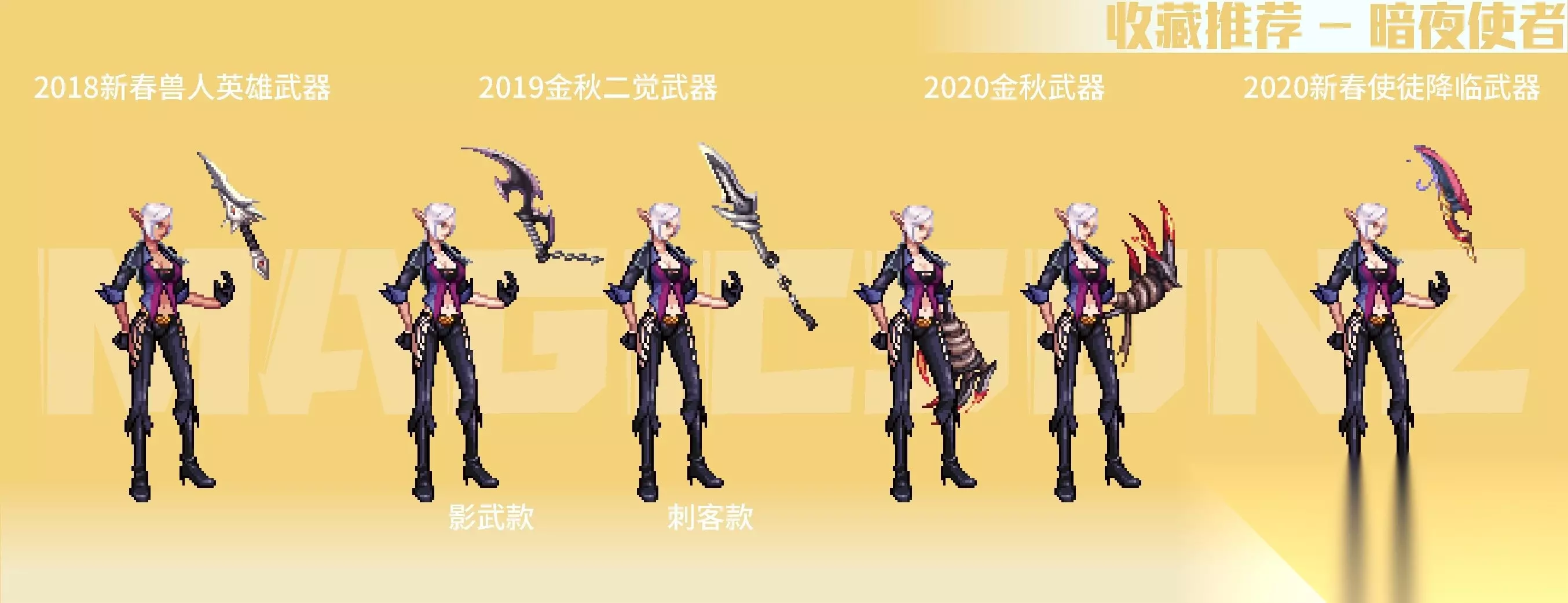 【简评】 女圣职系武器装扮推荐,与往期无二,在国服对其武器外观进行调整后,各类礼包装扮可以说各有买点。2019金秋二觉武器装扮中的奶妈款,可以视作对早期周边武器装扮的被刺,简直可以说是一模一样(划掉),推荐入手。 2019新春武器装扮,目前少数硕果仅存的光之十字,辉光链接设计很有趣,减轻了武器的重量感,是这一期武器装扮中,最适合散搭的职业武器之一。2020金秋武器装扮,花女主题的图腾外观,未开的花蕊含苞欲放,搭配各类浅色系穿搭都很好看;2021金秋武器装扮,淡蓝荧光斧头用传统斧式造型+浅蓝外发光,营造出凝练的力量感,推荐收藏;2022金秋幻梦蝶舞武器装扮,镰柄处大幻翼蝶的点缀非常亮眼,补充了镰刀武器的整体视觉观感,配合攻击的幻蝶特效,非常推荐收集。 聊到女圣职的名门猫咪武器装扮,各职业系中较为普通的一款,猫咪玩偶锤的动态表现较少,不过也是比较优质的武器外观装扮。 六、暗夜使者 【推荐装扮】