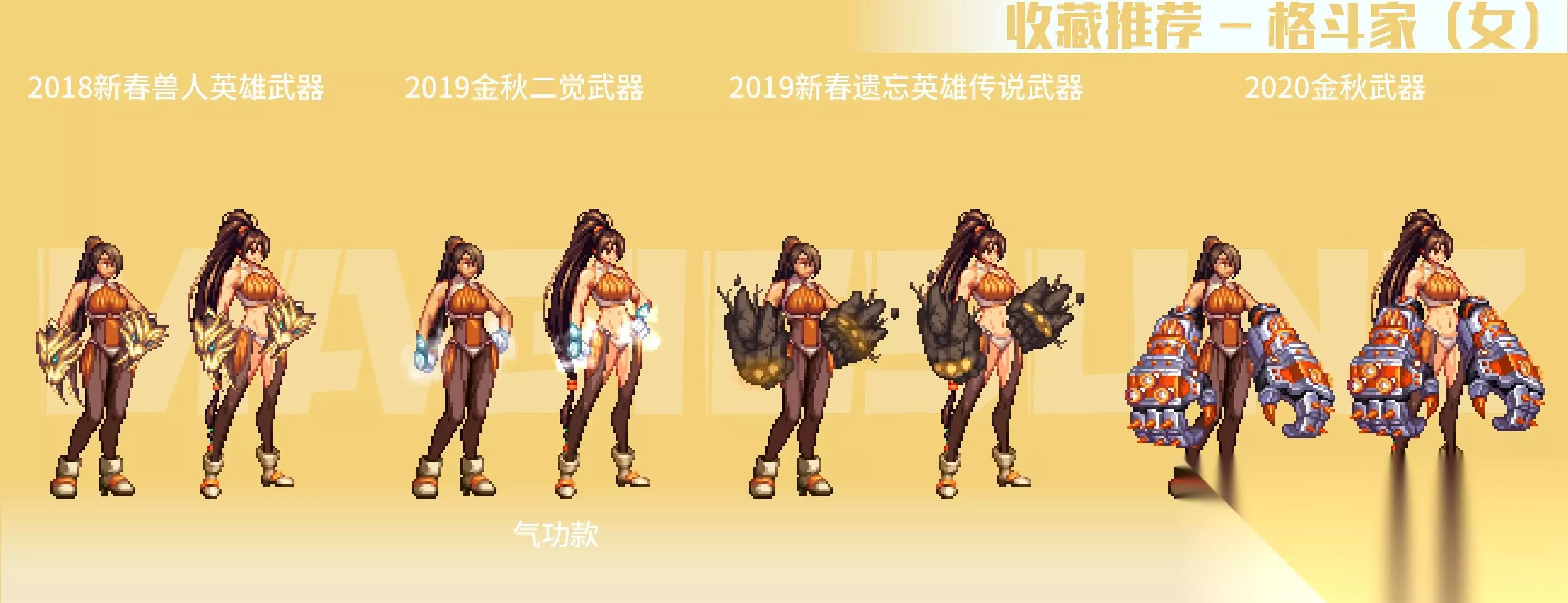 【简评】 女格斗职业系有很多巨拳、带念气(风月)武器装扮,从特殊性来说是比较丰富的。韩服也已经上线女格斗的模型重置相关内容,因此对女格斗的推荐展示结合新模型一起阐述。在二次觉醒武器装扮中,最推荐的自然还是气功款风月武器装扮,氤氲的念气流转,十分百搭。 18新春兽人英雄武器装扮的金色狼爪可选,整体造型比较霸气,搭配同色系时装组合效果不错。2019新春遗忘英雄传说的岩石巨拳视效很有冲击力,新模型版本重绘后,比例更加协调且富有冲击力,很有潜力值得推荐;2020金秋武器的巨拳外观,在目前模型下有比较特殊的攻击表现形式,是优秀的武器外观选择。 名门猫咪武器,格斗系不带有其他职业大系的宠物,不过装扮自身的肉球、伸缩猫爪的还原都很生动,造型可爱,便于搭配时装,也比较推荐。 三、神枪手(女) 【推荐装扮】