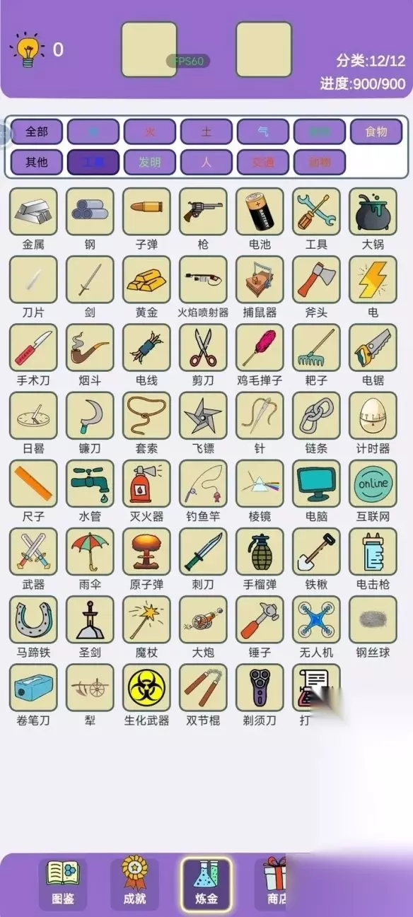 简单的炼金术工具系列合成公式大全 1、金属= 火+石头 2、钢= 金属+煤 3、子弹= 金属+火药 4、枪= 金属+子弹 5、电池= 金属+木炭 6、工具= 金属+人 7、大锅= 金属/钢+女巫 8、刀片= 金属+石头 9、剑= 刀片+金属/钢 10、斧头= 刀片+木头 11、手术刀= 刀片+医生/医院 12、黄金= 金属+太阳/彩虹 13、火焰喷射器= 火+枪 14、捕鼠器= 金属/木头+奶酪 15、电= 金属+能量 16、烟斗= 木头+烟草 17、电线= 金属+电 18、剪刀= 刀片+刀片 19、鸡毛掸子= 工具+鸡毛 20、耙子= 工具+干草 21、电锯= 斧头+电 22、日晷= 太阳+时钟 23、镰刀= 刀片+草/小麦 24、套索= 绳+马/奶牛 25、飞镖= 刀片+星星 26、针= 金属+线/干草 27、链条= 绳+金属/钢 28、计时器= 鸡蛋+手表/时钟 29、尺子= 木头+笔 30、水管= 水+烟斗 31、灭火器= 二氧化碳+火/金属 32、钓鱼竿= 鱼+木头/工具 33、棱镜= 玻璃+彩虹 34、电脑= 书呆子+工具/电 35、互联网= 电脑+电脑 36、武器= 金属+工具 37、雨伞= 雨+工具/布 38、原子弹= 能量+爆炸 39、刺刀= 枪+刀片/剑 40、手榴弹= 金属+爆炸 41、铁锹= 工具+园丁 42、电击枪= 枪+电 43、马蹄铁= 马+金属 44、圣剑= 剑+石头 45、魔杖= 木头+星星/男巫 46、大炮= 火药+城堡/海盗船 47、锤子= 木头+金属 48、无人机= 飞机+机器人 49、钢丝球= 毛线+钢/电线 50、卷笔刀= 刀片+笔 51、犁= 金属+陆地 52、武器= 细菌/病毒 53、双节棍= 木头+链条 54、剃须刀= 刀片+电池 55、打字机= 工具+书