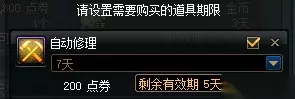 一、契约类 1、自动修理 自动修理契约是非常实用的契约,每一个玩家都用得到。勇士们可通过商城-道具-契约-魔王之契约该买自动修理。目前自动修理200点券7天,7777欢乐代币券至少可以购买38次契约,266天。