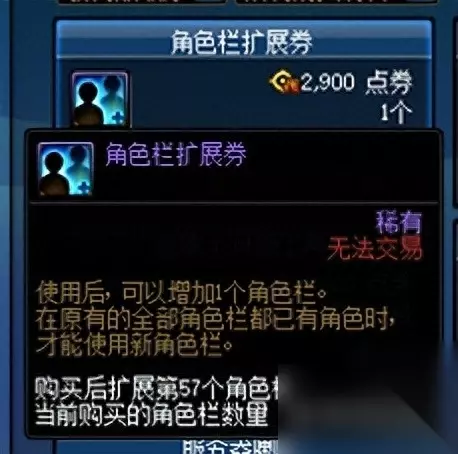 二、扩展类 1、角色栏扩展券 角色栏扩展券可以增加1个角色栏。周年庆版本上线了弓箭手的2个新职业,勇士们若错过了之前活动的角色栏扩展券,可以趁机购买。 目前角色栏扩展券的价格为2900点券,勇士们可根据需求购买。