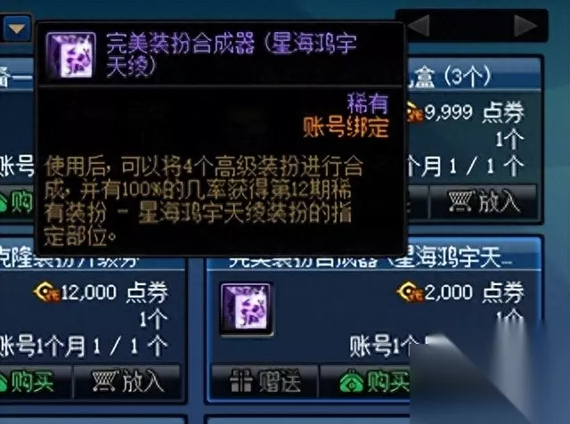 2、完美装扮合成器 在商城-活动-每月这里,我们可以用2000点券购买1个完美装扮合成器。该道具会消耗4个高级装扮,然后100%合成获得1件指定部位的第12期稀有装扮。若勇士们天空装扮还没收集齐,可以考虑购买此道具。